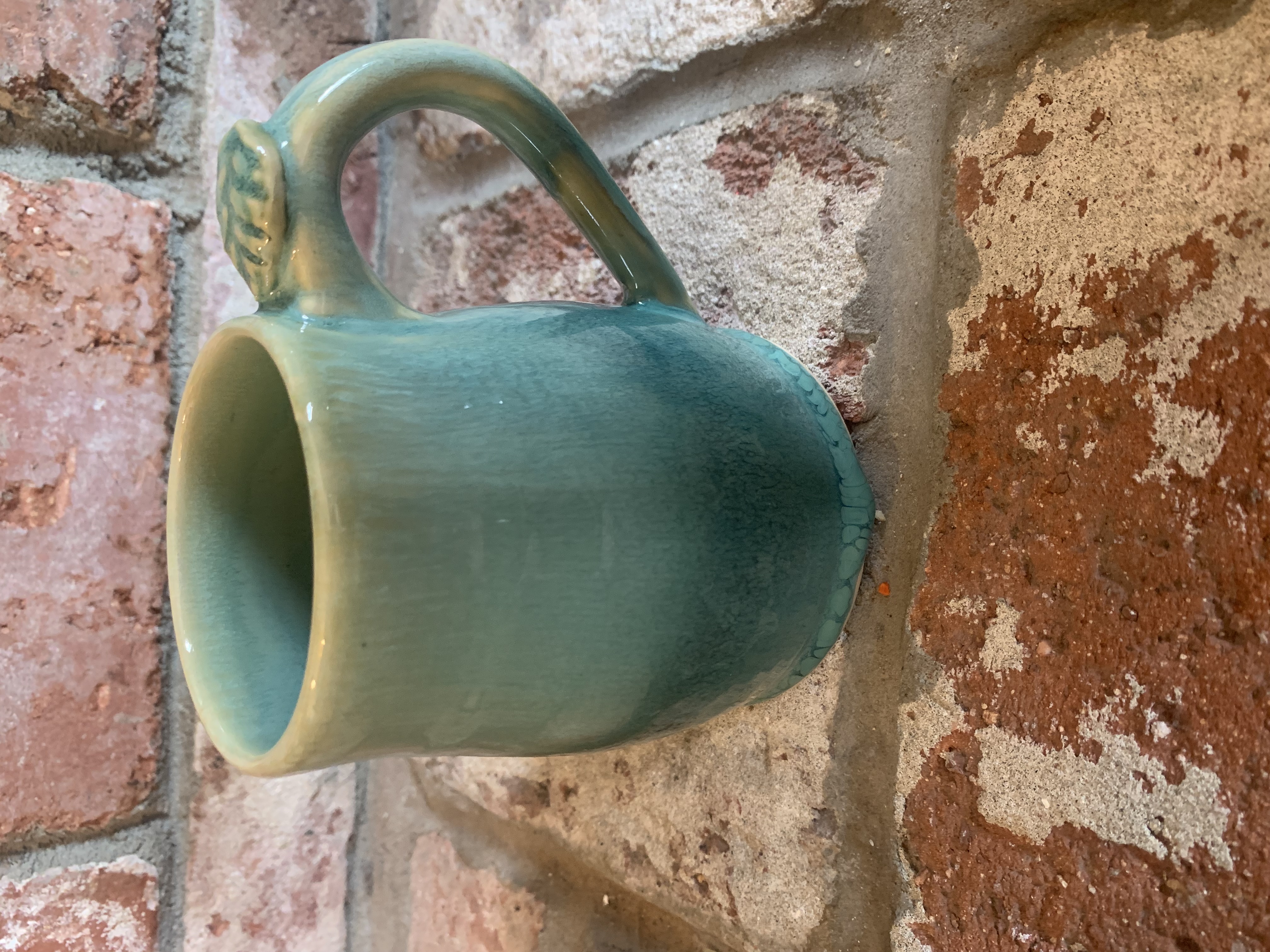 Green ceramic mug glazed in shades of fuzzy greens. Dishwasher and microwave safe.